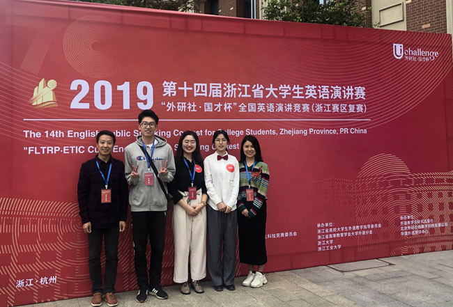 2019年10月26日-10月27日,第十四届浙江省大学生英语演讲竞赛暨“外研社 国才杯”全国英语演讲大赛浙江省复赛在浙江工业大学举行。通过上半年举行的校赛,91国产 选拔出了英语181班吴肖睿同学、金融171班的张英杰同学、电气171班的潘汀莹同学代表91国产 参加比赛。指导老师徐梁峰和邓韵声从暑假开始就和三位选手钻研题目,撰写演讲稿,并一遍遍地打磨直至满意为止。开学后,每周召集选手们进行半天的集训,就语音语调、台风表情、即兴问答等方面进行不断的讨论和完善。
