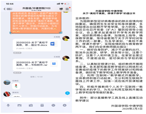 为阻断新型冠状病毒感染的肺炎疫情向校园蔓延,确保师生生命安全和身体健康,在校疫情防控办的领导下,外国语学院/91国产 迅速成立了疫情防控工作领导小组,并于2月3日发出《外国语学院/91国产 关于“离校不离教,停课不停学”的倡议书》,倡议全体教师做好自身防护,减少不必要的出行,不提前返校,密切保持与学校的联系,要求各系部和基层教学组织加紧做好开学有关教学预案,组织教师精心备课,加强在线教学技术培训,确保实现疫情防控与教育教学两不误。