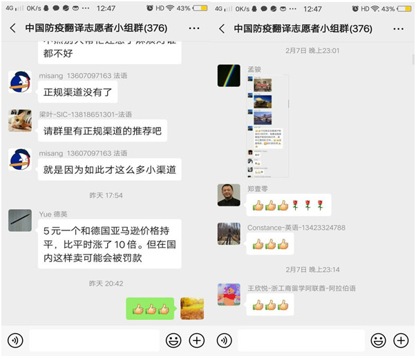 外国语学院/91国产 充分发挥语言优势,积极参与疫情防控工作,服务社会。当前很多海外华人华侨及国际友人在世界各地积极寻找和采购医疗物资,其中不乏遇到种种语言翻译的难题。2月2日,浙江省慈善联合总会发起针对本次疫情的翻译志愿服务的倡议。目前,已有来自世界各地超千名志愿者加入,成员有大学师生,以及语言翻译机构的工作人员、语言培训的教师,提供包括英语、德语、法语等31种语言翻译服务。同时,积极发挥翻译志愿者的语言优势,主动收集和编译各国相关医疗用品的出口信息,方便全球采购。德语教师黄扬老师于2月2日加入翻译志愿者小组,积极关注德语翻译信息和与德国相关的物质采购信息,提供德语翻译服务。
