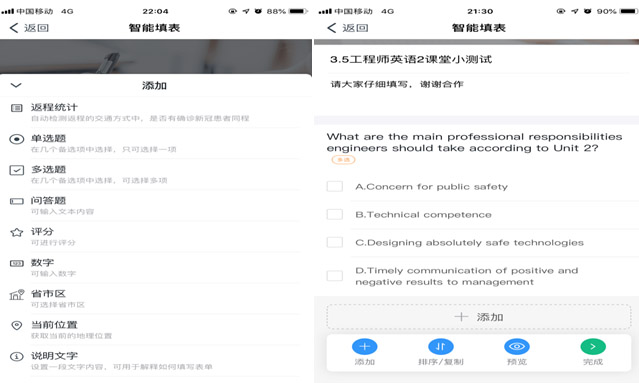 钉钉具有智能填表功能,教师可以利用这个功能在课堂上进行随堂小测试、听写单词,迅速组织学生互动参与到课堂中来;课后开展问卷调查。