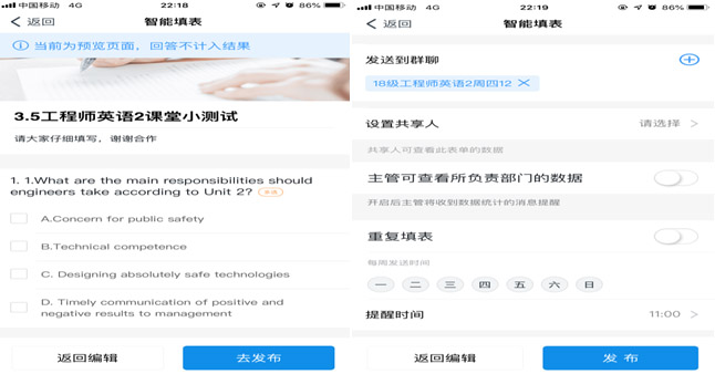 最后,在编辑完成后可以点击“预览”,检查一下测试的内容是否正确无误。有错误可以点击“返回编辑”进行修改。确认没有问题后,点击页面右下角的“去发布”,这样就可以让班级成员填写智能填表的测试题目了。在发布时点“发送范围”选择需要发送的班级,就可以立刻发布测试了。