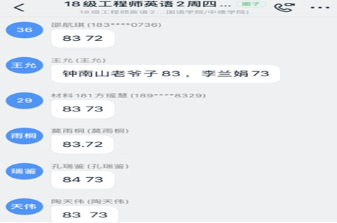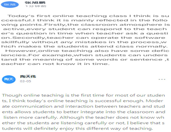充分发挥手机能够无障碍语音输入功能、钉钉平台具有将语音及时转换成中文和英文的功能,以及每名学生均有电脑,可以快捷打字的便利。另外,教师也可以同步了解每一名学生的参与和学习情况,并同步了解学生中存在的问题,马上开展有的放矢的教学。如: