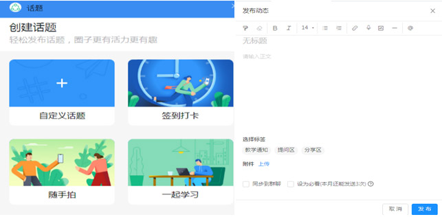 打开“教学通知”栏目中的右下角“+”,将看到两个栏目,一是“创建话题”,二是“发布动态”,教师根据需要创建讨论的话题或发布动态。如下图: