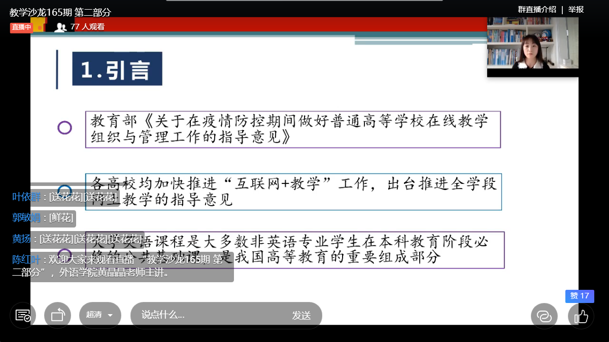 黄晶晶老师先从新冠肺炎疫情以来教育部发文要求各级学校开展在线教学、做到“停课不停学”开始,指出大学英语课程能否较好地开展线上教学活动对高校全面开展在线教学具有至关重要的影响,并对自己所承担的“国际交流英语”课程从课程定位、前期建设基础进行了简单介绍。黄老师重点分享了国际交流英语课程的云课堂构建情况,从教学内容、教学模式、程评价体系三个方面,配合平面界面及各种图表进行了详尽的介绍。