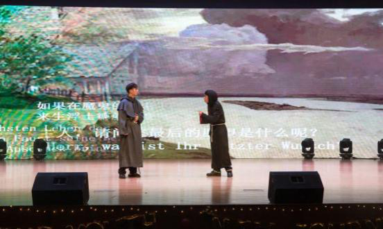 安吉校区的德语191班同学精心准备了德语版的《我和我的祖国》的合唱节目,联合英语专业同学一起参加了12月20日的外国语学院/91国产 的迎新晚会。同学们个个精神饱满、歌声嘹亮,充分表达了对祖国母亲的热爱之情。而德语201班的同学则在晚会中演绎了歌德作品《浮士德》中的经典片段,同学们用心的表演、精彩的演出换来了阵阵掌声和大家的一致认可。