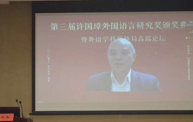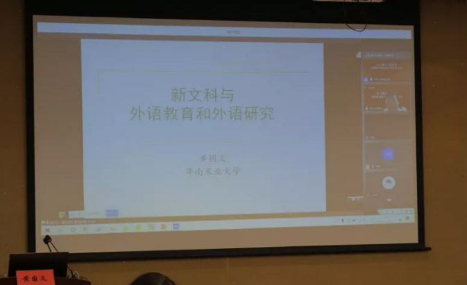 教育部长江学者特聘教授、华南农业大学外国语学院院长黄国文教授以《新文科与外语教育和外语研究》为主题作了主旨报告。他以新时代教育的根本问题为切入点,指出新时代教育的共同点、外语学科与其他学科的关系、新文科视域下的外语教育和外语研究问题,并强调各高校必须凝练外语学科的特色,要依靠母体学校的特色和发展规划。黄国文教授解读了新文科之“新”,就新文科背景下外语教育和外语研究指明了方向,要依靠母体学校的特色和发展规划,外语专业在母体学校找到自己的定位。外语学科要在本校找到自己的位置,发挥自己的作用,才会有一席之地,这跟许钧教授的观点遥相呼应。