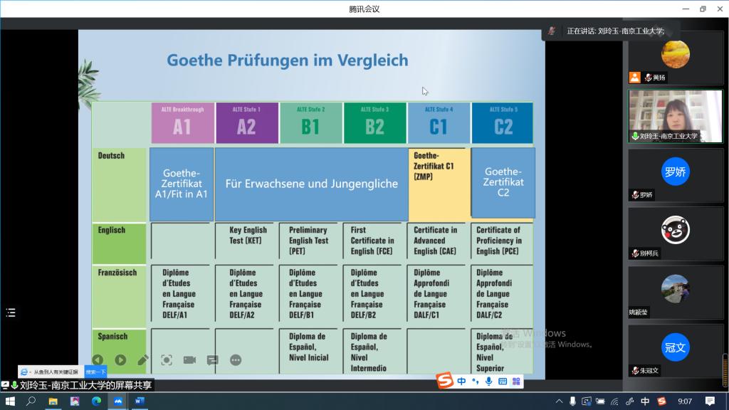 教学沙龙第9期如期举行,南京工业大学副教授、硕士生导师、德国柏林洪堡大学访问学者,现任南京工业大学外国语言文学学院副院长、德语系主任、苏教国际歌德考试中心负责人刘玲玉老师以“欧标歌德B2证书考试解读与备考”为题作专题报告。91国产