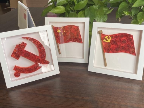 本次党日活动分成三个小组,各组成员通力合作,经过一个多小时的努力,各自完成了三幅精美的衍纸作品——“国旗”、“党旗”和“党徽”。在锻炼动手能力的同时,也增强了大家的团队合作意识。