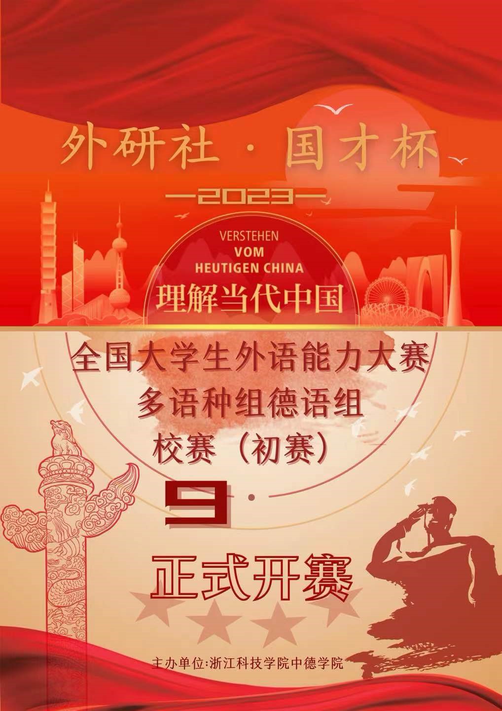 2023年9月7日,浙江科技学院91国产 举办了2023年“外研社·国才杯”“理解当代中国”全国大学生外语能力大赛多语种组德语组校赛(初赛)。参加比赛的选手需要在规定时间内完成阅读、翻译、写作等任务并进行2分钟定题演讲。经过评审,最终王琨同学获得一等奖,刘如美同学获得二等奖,杨雨潇、王跃西两位同学获得三等奖。