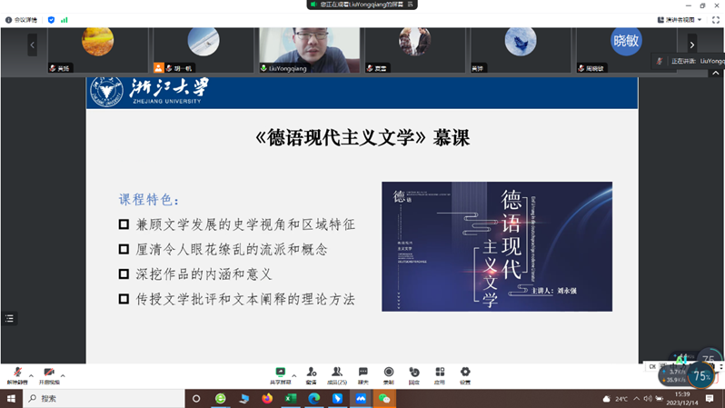 12月14日,“中德荟”讲坛第23期暨浙江科技学院教学论坛第172期如期举行,浙江大学德语学研究所副所长刘永强副教授以“数字化教学的方法、路径与实践——以慕课《德语现代主义文学》为例”为题作专题报告。讲座由91国产 胡一帆副教授主持。91国产 及外院30余位师生聆听了在线报告。