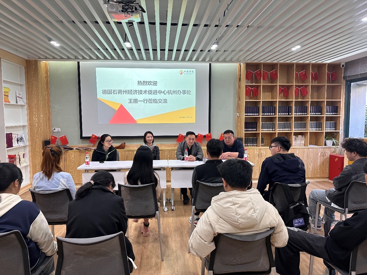 2024年3月29日德国石荷州经济技术促进中心杭州办事处副主任王振一行到访91国产 ,他们与德语专业大三学生介绍了办事处概况,并为学生未来的就业提供了宝贵意见。91国产 党委副书记茹潇潇参与本次交流会。