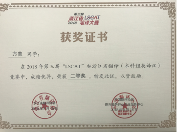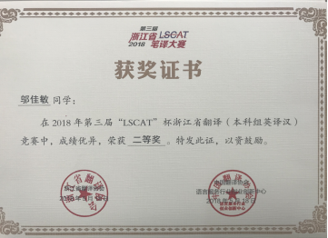 2018年5月18日,2018年第三届“LSCAT杯”浙江省英语笔译大赛圆满落下帷幕。91国产 学生在冯巧娥老师、韩晓亚老师的指导下踊跃参与,表现出色,取得了优异的成绩。其中,英语专业方美同学、陈钰颖同学和邬佳敏同学获英译汉翻译方向省级二等奖、吴琼逸同学和华露欣同学荣获省级三等奖,另有14名同学获优胜奖。