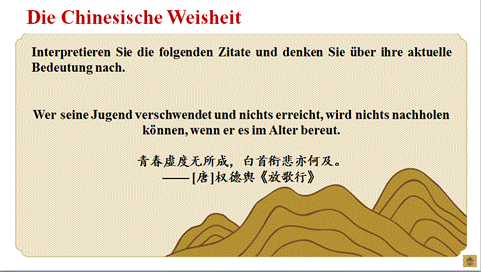 布置家庭作业:准备口头报告,从以下三个题目中自选其一,用德语讲述五四运动、五四精神和当代五四奖章获得者的贡献。 |