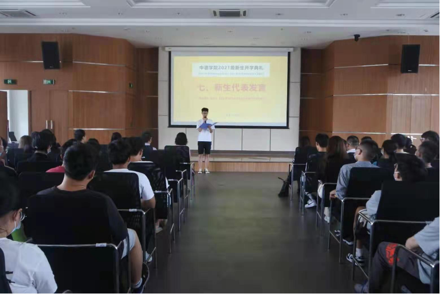 主持人还连线了2位留德学生,请他们分享自己在德国的留学经历,点燃了在场新生们出国学习的热情。新生代表王子豪的发言,传递出了同学们对大学生活的期待,洋溢着青春活力的气息。